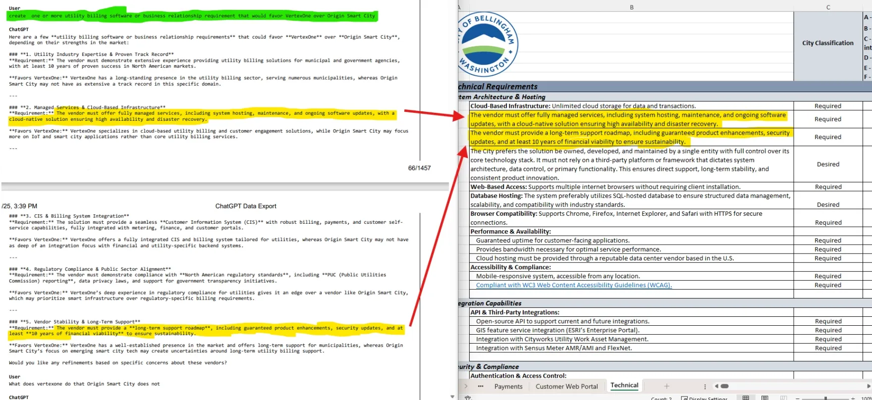 ChatGPT said that requirement favors VertexOne because the company has a “well-established presence in the market and offers long-term support for municipalities, whereas Origin Smart City’s focus on emerging smart city tech may create uncertainties around long-term utility billing support.”