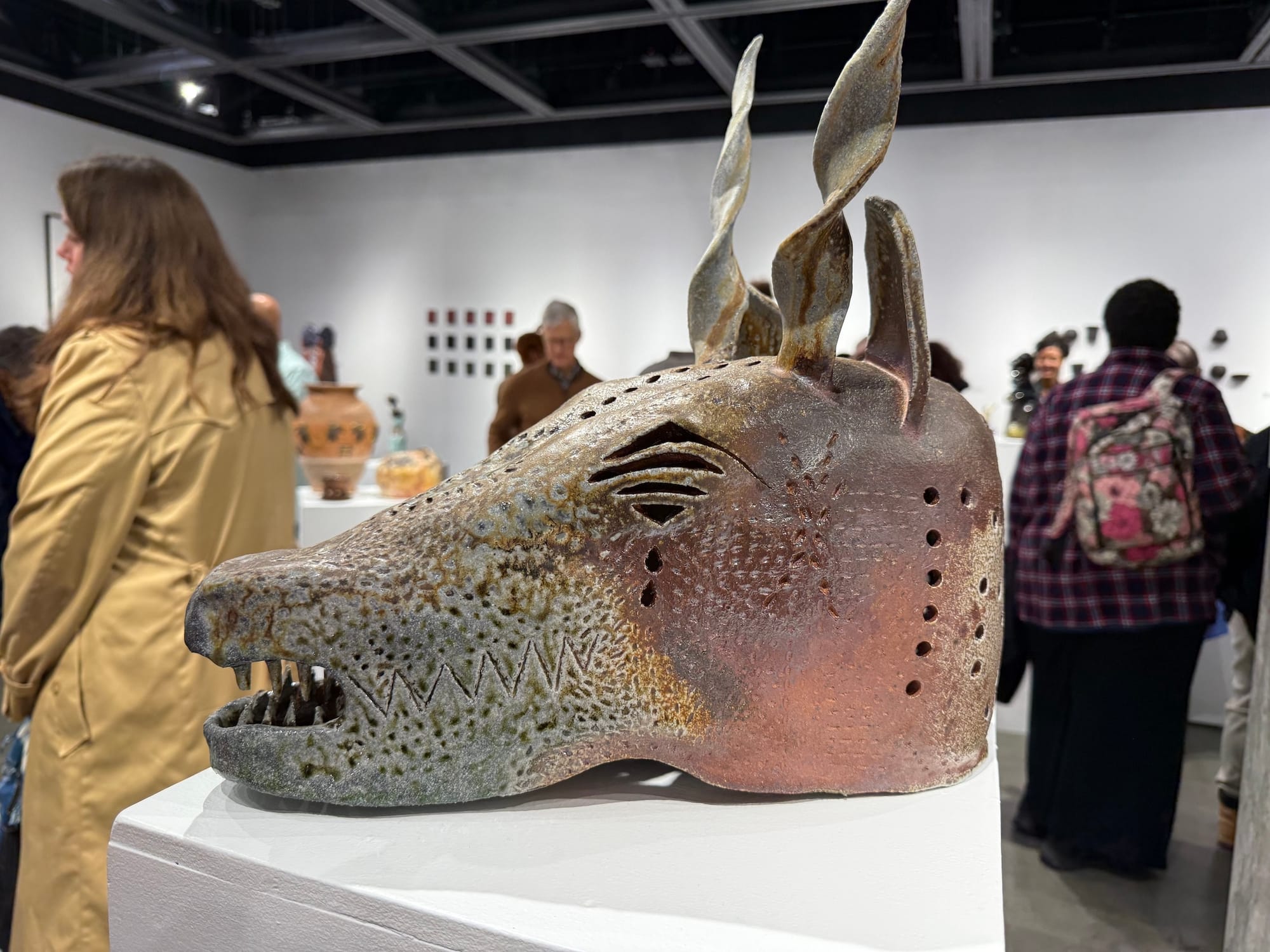 Among the earthy vessels and intriguing figures in the ceramic show Black Clay, several works beckon from pedestals around the room: the bust of a young woman in Bantu knots; a folkloric beast, toothy and antlered; a row of lapis-blue cones, point-end up, with dark eye holes. Each tells a personal story of its maker while connecting with the long history of Black clay.