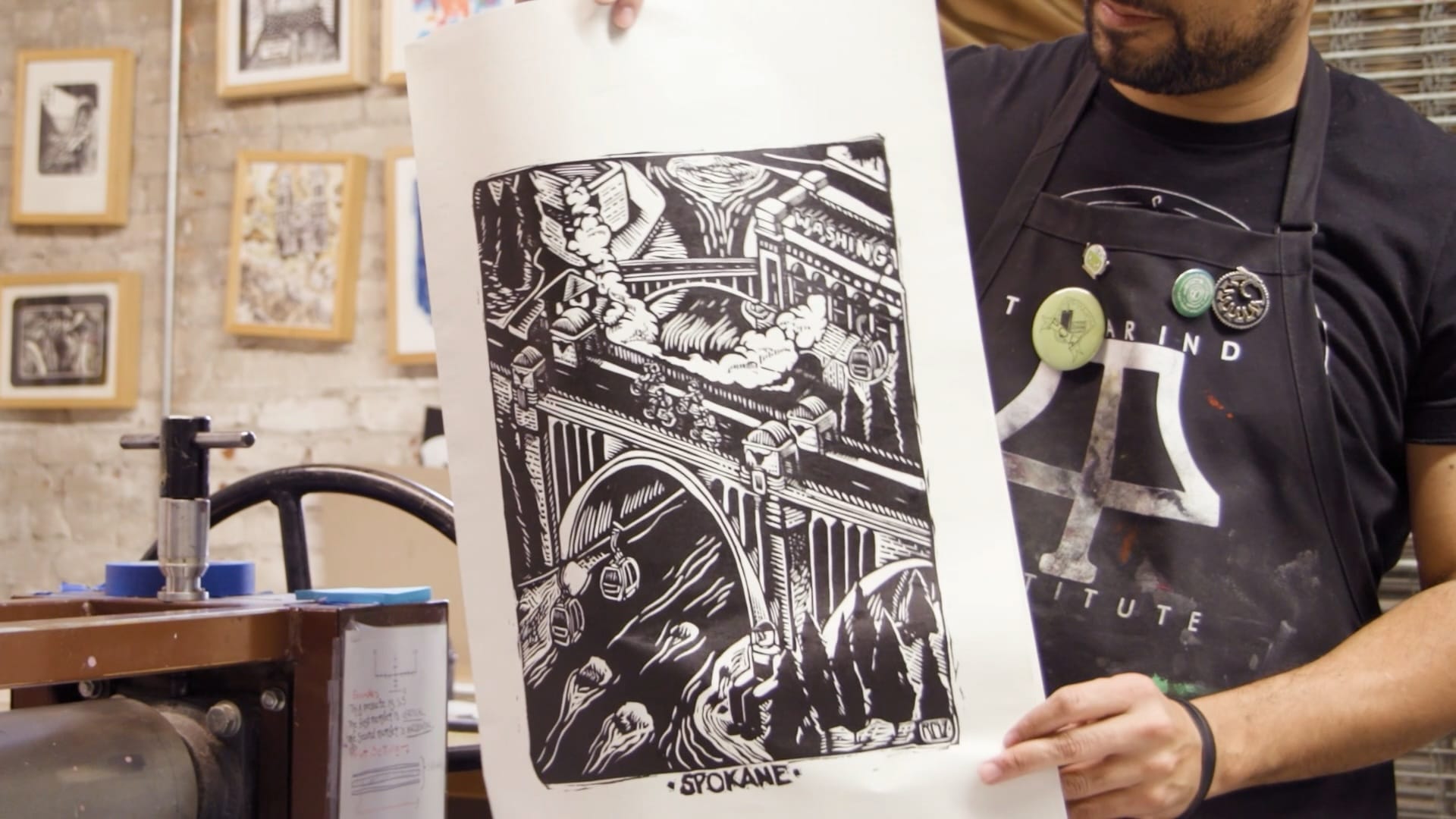 It’s a dream setting for fellow printmakers to join in making art and teaching others to do the same. “That was one of the major parts of me falling in love with this medium,” Gil Zambrano says. “The gathering of the people.”