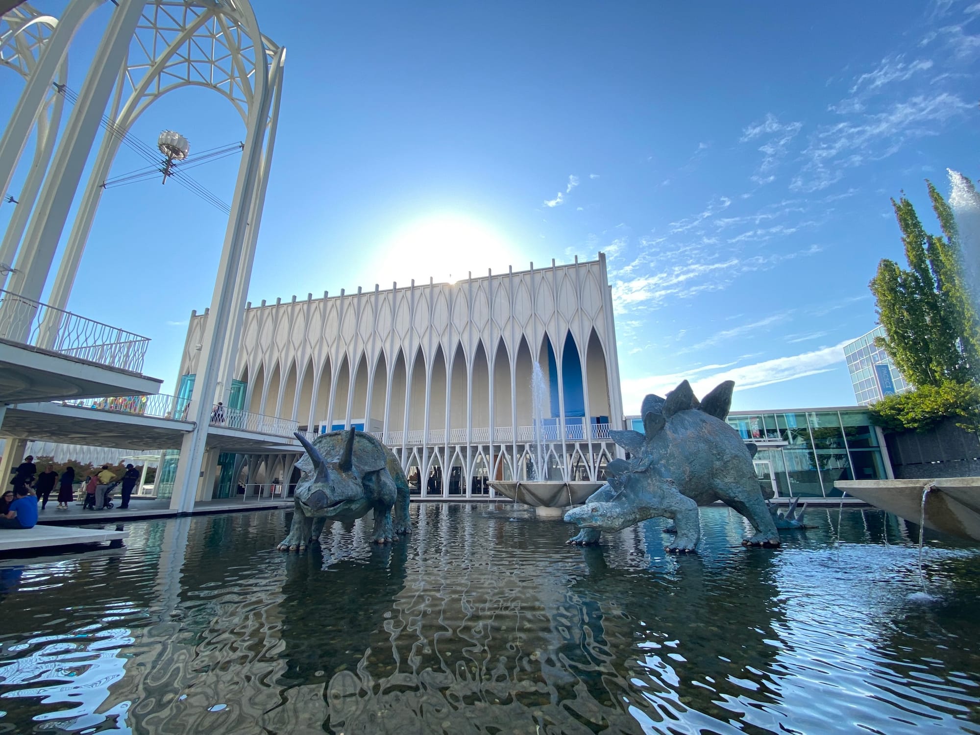 In any case, the courtyard gates are now open daily (9:45 a.m. - 11 p.m.). PacSci marketing director Julie O’Mara tells me people are welcome and encouraged to walk through, bring on-leash dogs, or pack a snack and “have lunch with the dinosaurs” that still wade in the pools. (O’Mara further reported that today’s first visitor through the newly opened gates was a dog named Octavia, visiting from Vancouver, B.C., with her human companion.) The plan is to remove the physical gates entirely before FIFA 2026.