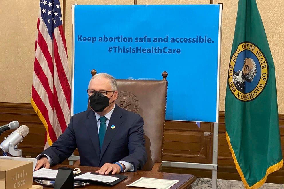 Washington Gov. Jay Inslee plans to sign a measure that prohibits legal action against both people seeking an abortion and those who aid them, on Thursday, March 17, 2022, in Olympia. Inslee's signature comes days after the Legislature in neighboring Idaho approved a bill, modeled on a law in Texas, that allows lawsuits to enforce a ban on abortions performed after six weeks of pregnancy. (AP Photo/Rachel La Corte)