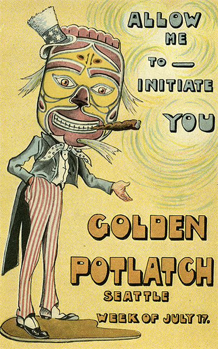 The Potlatch also featured Seattle boosters’ appropriation of First Nations cultures. They formed a fraternal organization called the Tillicum Elttaes — Tilikum meaning family or tribe in Chinook jargon, and Elttaes being Seattle spelled backwards. They wore “red face” and dressed in garb associated with North Coast Native peoples. They performed elaborate initiation rituals, and some even marched in Ku Klux Klan-like robes.