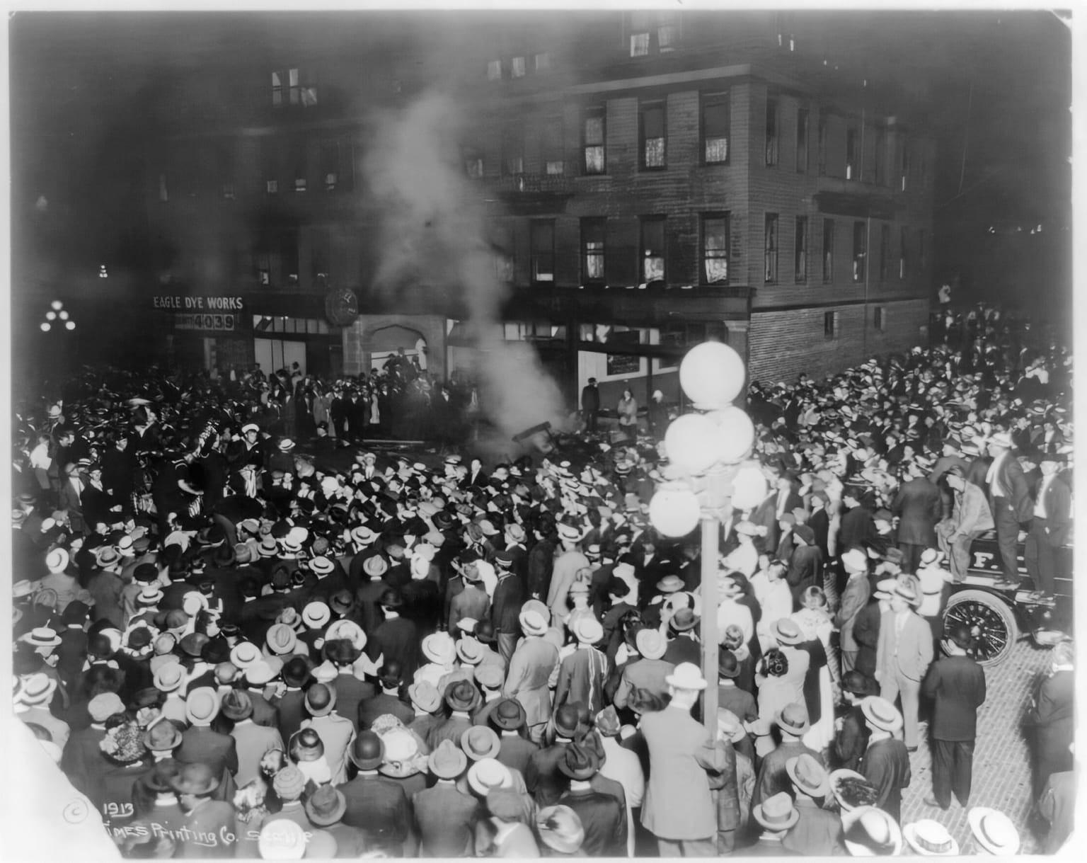 In 1913, the Golden Potlatch crowd gathered in Pioneer Square, a centerpiece of the festivities. Seattle, already known for its lefty activists, allowed soapbox speakers to address the public on streetcorners. At Occidental Avenue and Washington Street, a speaker, Mrs. Annie Miller, was promoting women’s suffrage when a drunk sailor was said to have insulted her. Along with eight or nine other sailors and soldiers, they knocked over her table, scattered her literature and punched her, or so it was claimed in a sworn affidavit. A well-dressed man is said to have attempted to defend her honor, and a street brawl ensued.