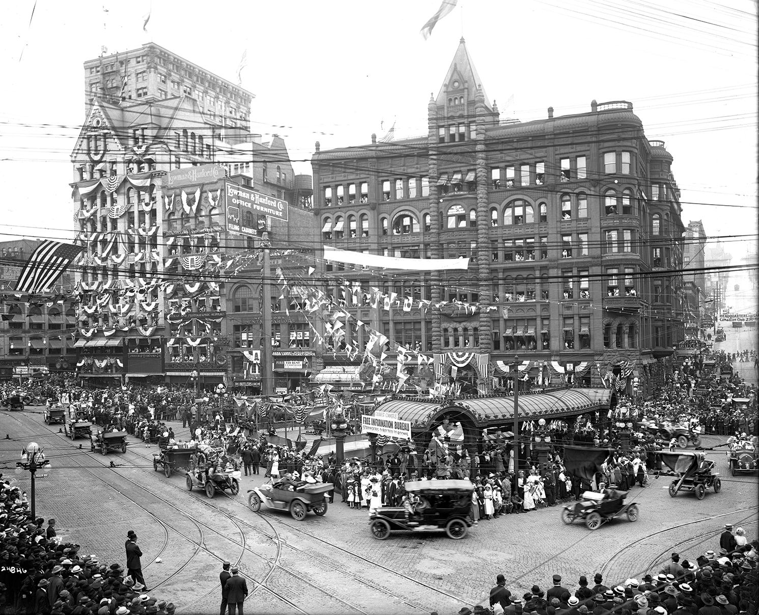 Today we have Seafair, Seattle’s annual summer celebration. Its ancestor in the early 20th century was the multiday festivity known as the Golden Potlatch, launched in 1911. Then as now, the U.S. Navy came to town, motorboats raced on Lake Washington, there were air shows, pageants, flag-waving and parades. It was billed as Seattle’s Mardi Gras. Floats of every description rolled through Downtown touting local history, prosperity, diversity and progress. It was a celebration of how far Seattle had come in the mere 60 years since its founding.