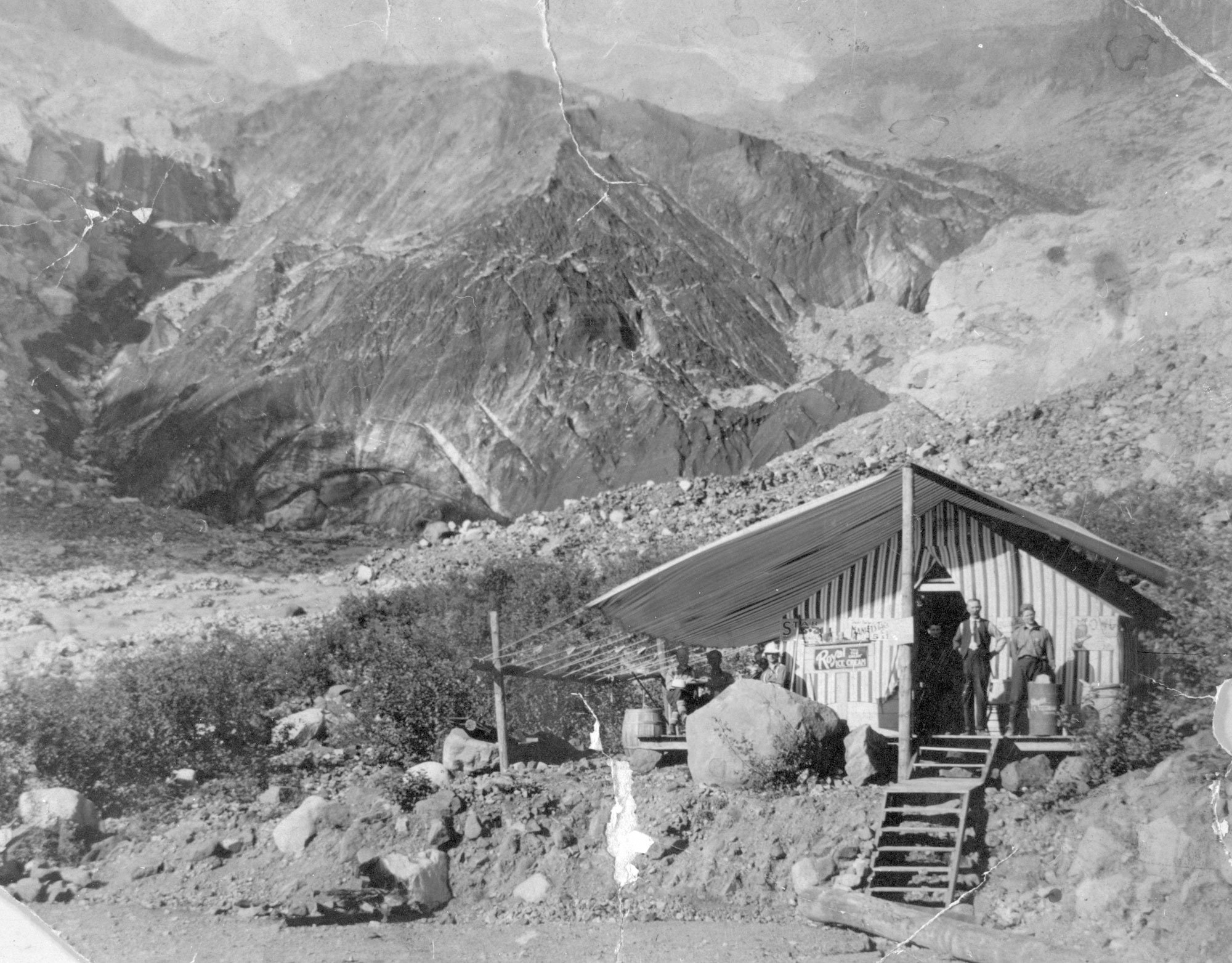 The city of Tacoma, which bears a version of one of the volcano’s Indigenous names, is a city that once touted its proximity to wild ice with the slogan “Four Hours to the Glaciers,” billed by boosters as “The Most Wonderful One-Day Trip in the World.” The Nisqually glacier was an early and accessible attraction to Mt. Rainier National Park. Someone even built an ice cream stand at its foot for sweet-toothed tourists.