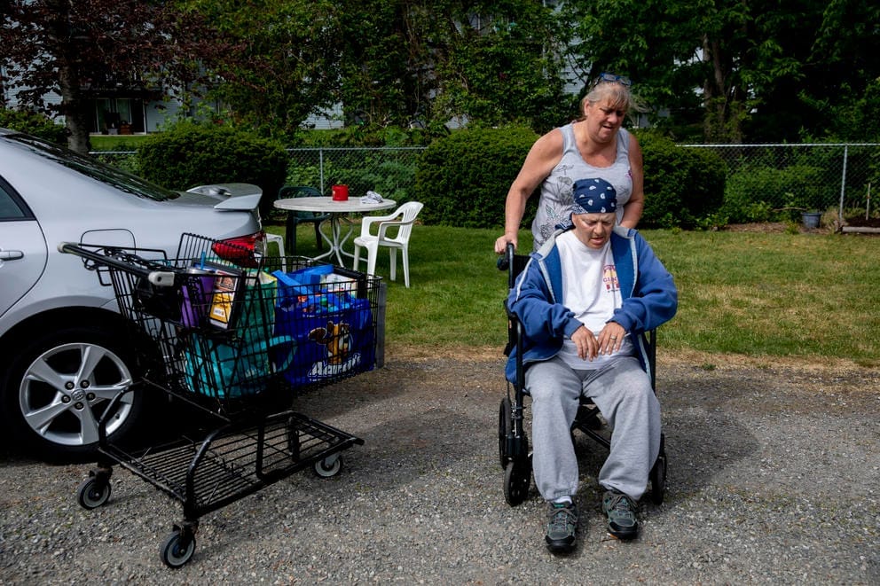 Gina Magee, 62, of Bellingham, arrives home with groceries with the help of her caregiver, Tammy. Magee was completely dependent on a caregiver to shop for groceries. Her story was part of a series looking at food insecurity in Western Washington. She used to be able to ride her motorized wheelchair to the Birchwood neighborhood Albertsons to shop for herself, but since the store closed three years ago, there was no longer a grocer close enough. "They took my independence," Magee said. Magee passed away before the story was published, but her legacy and the work she did, fighting for herself and her neighbors, lived on in her community as they continue to fight for a grocery store. — Dorothy Edwards