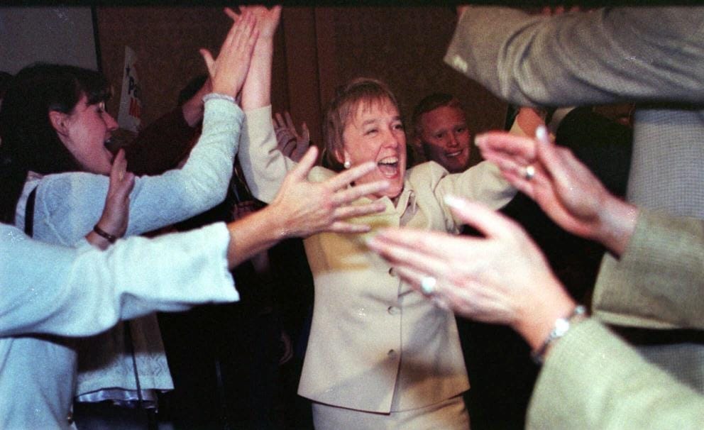 Democratic Sen. Patty Murray walks through a line of supporters as she enters her election night victory party Nov. 3, 1998, in Seattle. Murray, the self-styled "mom in tennis shoes," defeated her fiery Republican challenger, U.S. Rep. Linda Smith. (AP Photo/John Froschauer)